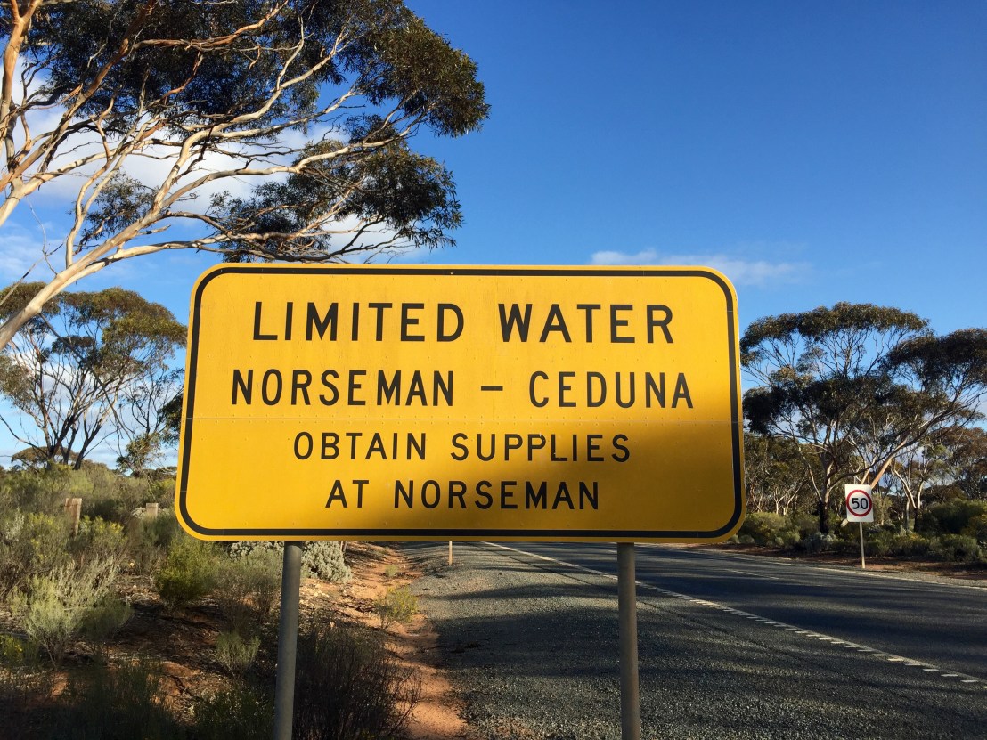 From Norseman we start on the Eyre Highway across 1,000km of desert known as the Nullarbor Plain. A sign down the road makes things clear: