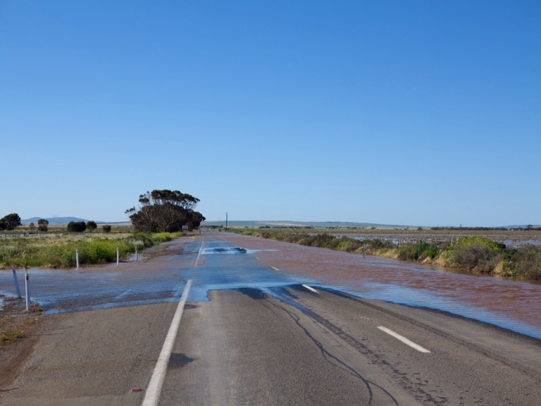 We had no real alternative but to continue heading south. Our choice was 70km back to Port Pirie or a detour of at least a few hundred kilometres. After discussion, we headed on with police approval so that we could assess the situation further down the road. 50km later we reached a second police motorcyclist roadblock. Same situation – he was looking good in his leathers and shades. Apparently it was all in the hands of a guy in charge of the road closure (Mr Road) and, after discussion, he allowed us to continue.