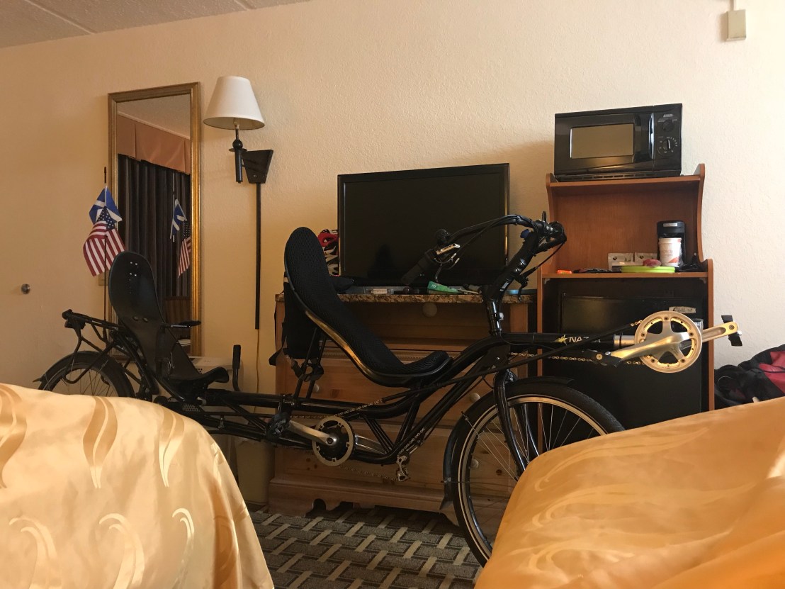 As we are touring, all our motels are on the edge of town so we can avoid traffic and its easier to get a ground floor room. That’s because one of our priorities is parking for the bicycle and, invariably the bike sits in front of the television and fridge.