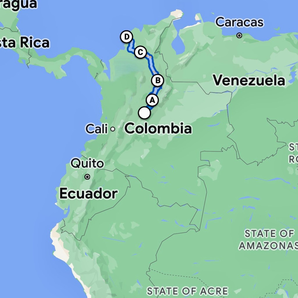 So this is our route for the first four days – Bogotá, Villa de Leyva, Bucaramanga, Mompos to Cartagena.