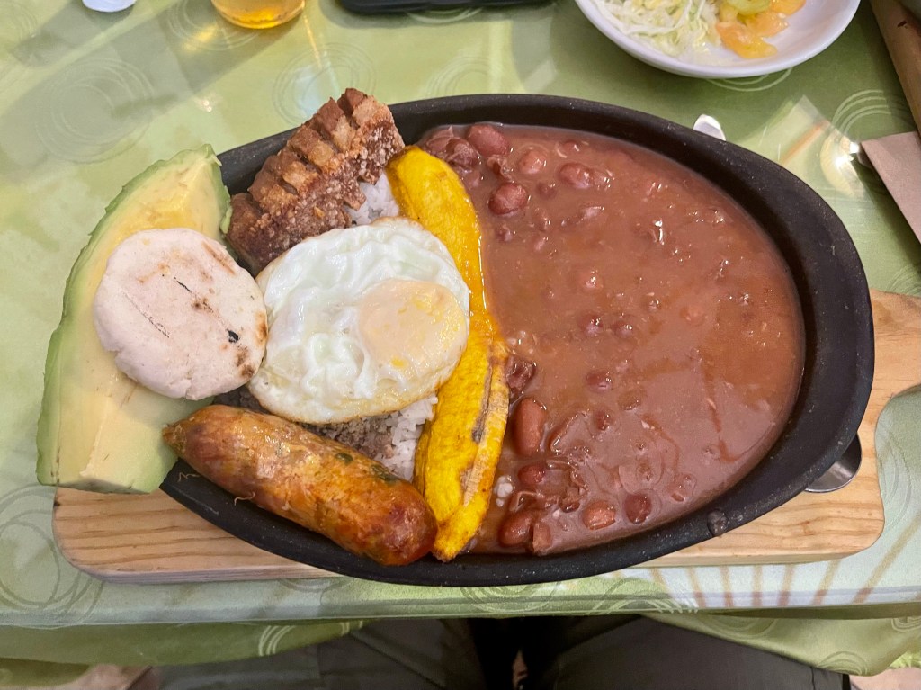 That evening, I treated myself to what is perhaps the most popular dish in Colombia, Bandeja Paisa. It’s the national dish. Now let me start by saying we haven’t been impressed with Colombian food and this wasn’t my first bean dish since I’ve bean here 🙂