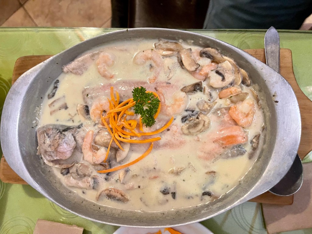Susan obviously went for something less interesting. However, because some people are more interested in Susan than me here’s a photo of her dinner – trout in a muchroom sauce. They like their trout in Colombia.