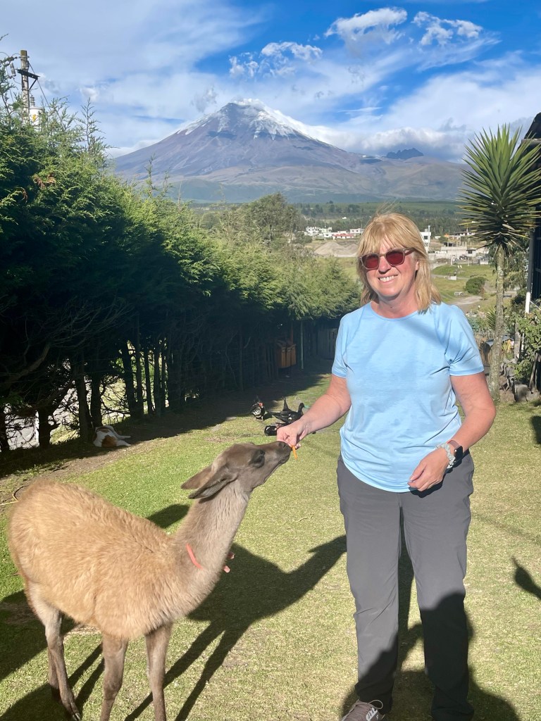 That’s Cotopaxi, third highest active volcano on earth. For the last two years climbers haven’t been allowed to the top as it’s a bit too active just now. Currently, it’s at Alert Level Yellow (second highest level). It’s a stratovolcano which means that it’s of a type that can explode violently upon eruption. However, just look at Susan – fearless as the baby llama. As she. says ‘ after being on the back of that bl**dy bike in Columbia, I have no fear of potential pyroclastic clouds’!