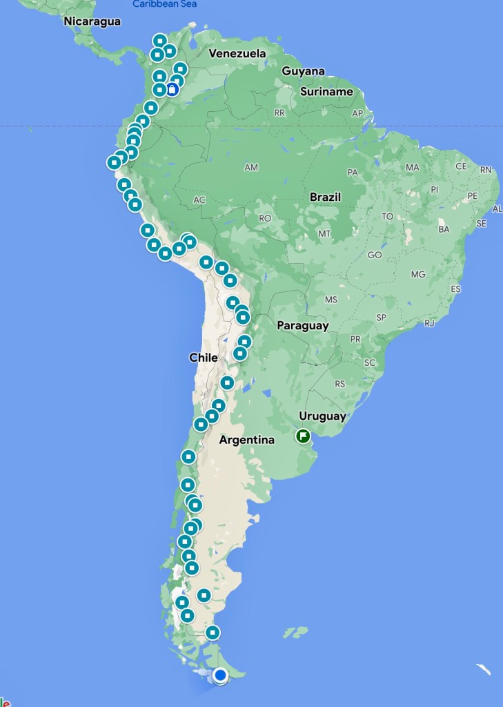 To recap. Blue dot at the top is Bogota. From there we headed north to Cartagena and that’s where the long road south began through Colombia, Ecuador, Peru, Bolivia, Chile and Argentina.