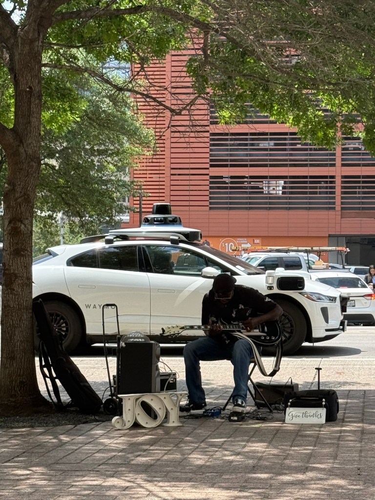 That’s the self driving taxi behind Joy. After successful trials in other cities, they recently arrived in Austin. It’s a strange sight to see a car rolling along city roads with no driver. These taxis are being steadily introduced across American cities and will be in Europe soon.