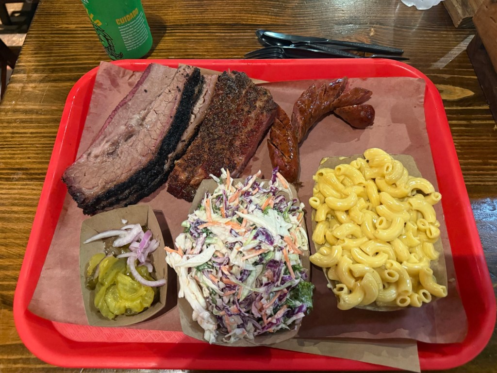 There’s over a kilo of the most tender smoked brisket, ribs and chilli sausage you will never have had unless you’ve been to Texas. It’s BBQ food heaven.
