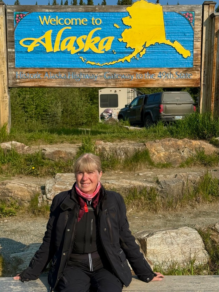 So here’s a photo of Susan at the Alaska border. Fresh from a 20 mile mud and gravel section. Still smiling!